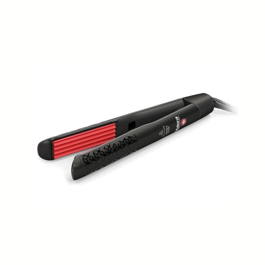 Met vier dunne, ondiepe gegolfde platen (24 x 90 mm, 3 mm hoog) met een uitgesproken profiel. De vijflaagse keramische coating met toermalijn zorgt voor een gelijkmatige warmteverdeling en een gezondere styling.