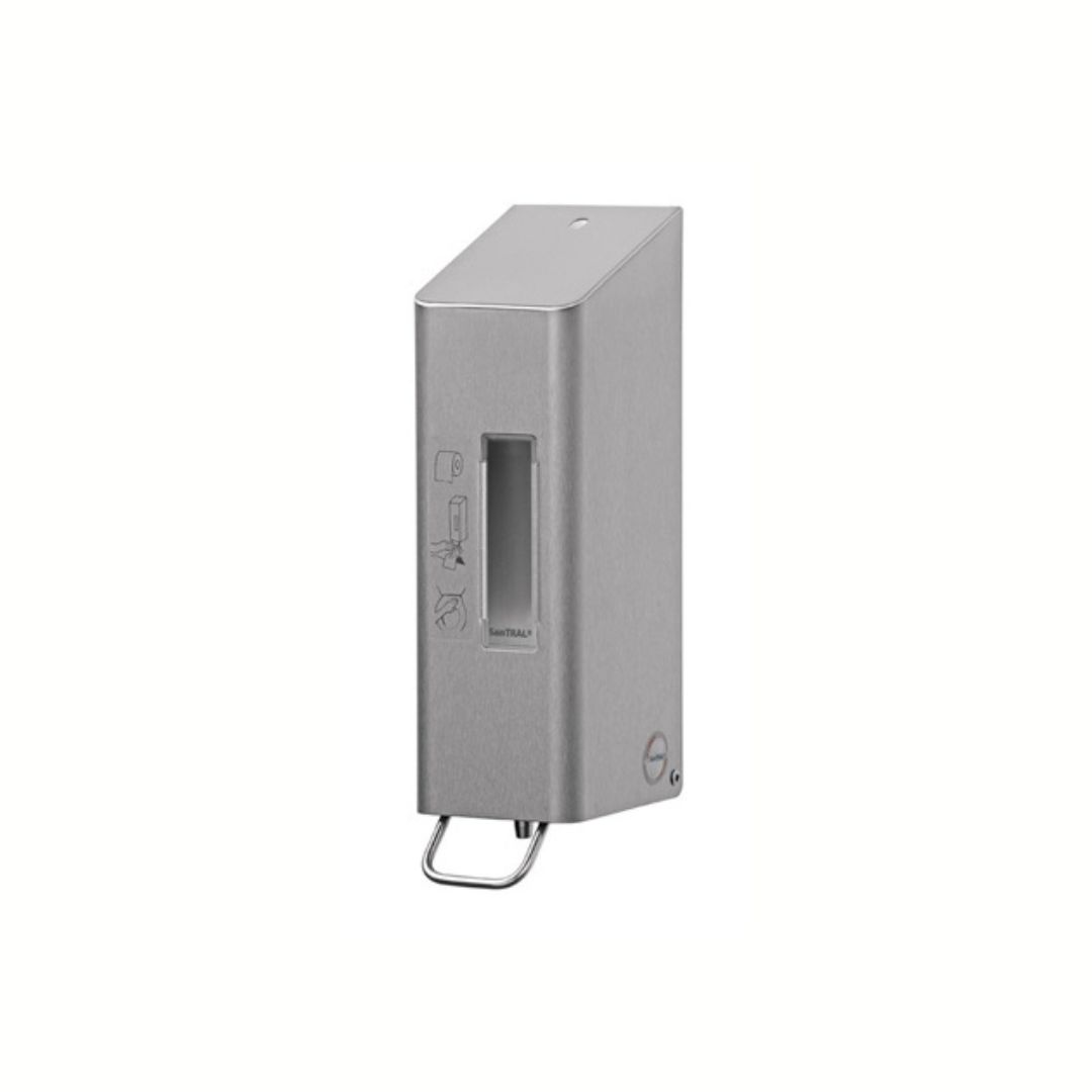 Deze dispenser combineert optimale functionaliteit met een opvallend, strak design. De robuuste roestvrijstalen behuizing valt direct op in een strak witte toiletruimte. De bediening is eenvoudig: met een druk op de roestvrijstalen hendel activeert u de dispenser en doseert u precies de juiste hoeveelheid alcohol op uw handen of een doekje.